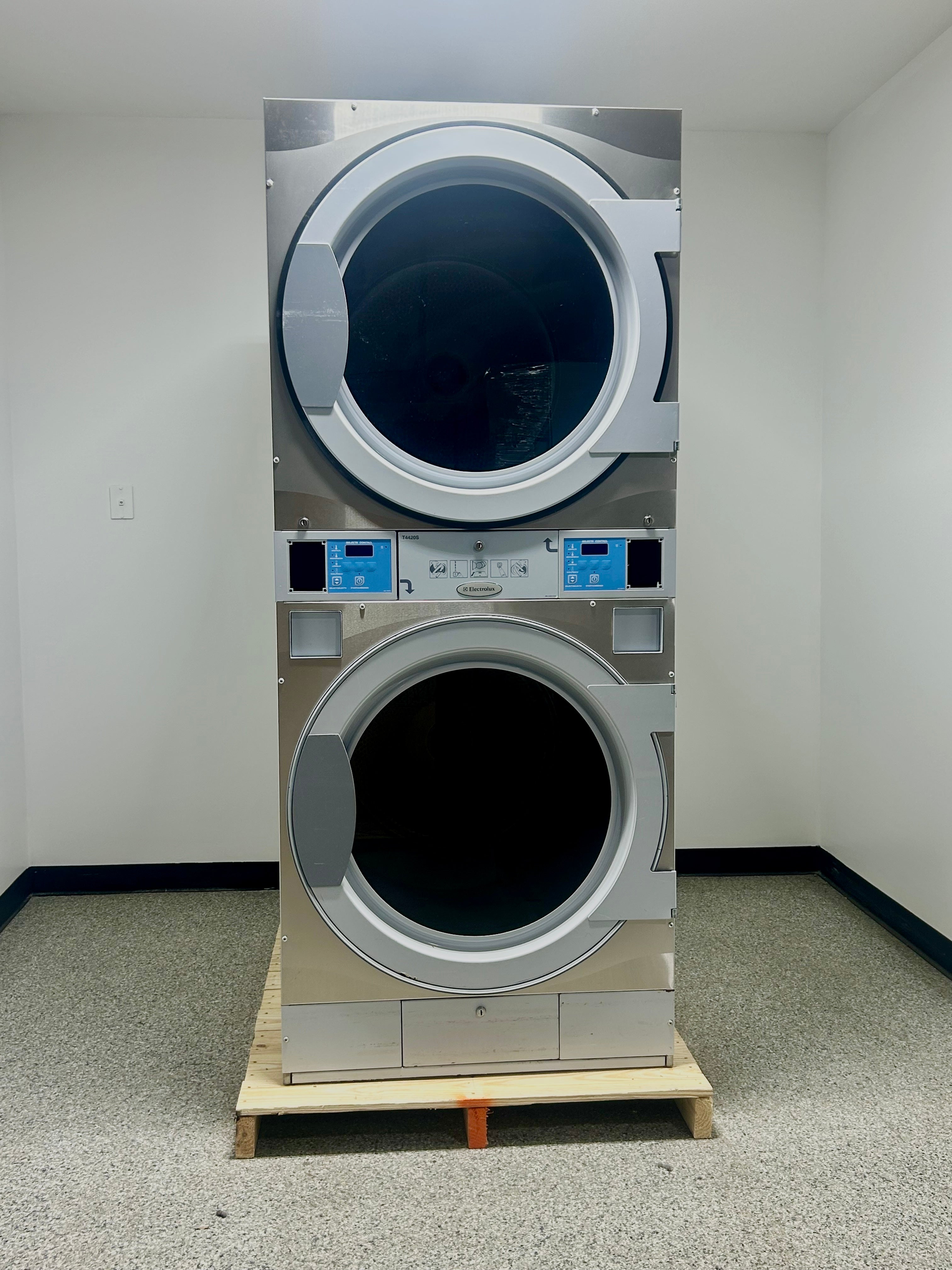 Refurbished Electrolux 45lb capacity stack dryers, ideal for any laundromat looking for reliable performance and long-term value. These commercial dryers feature stainless steel fronts, micro control interface, and coin drop operation.